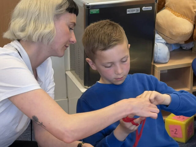 Jolene assisting a Claypotts Castle Primary School pupil with a hand-knitting technique