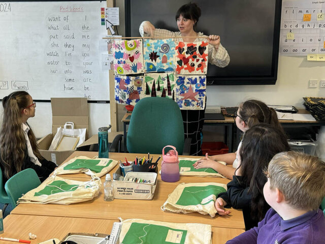 Kate showing pupils at Downfield Primary School printed wall hanging examples
